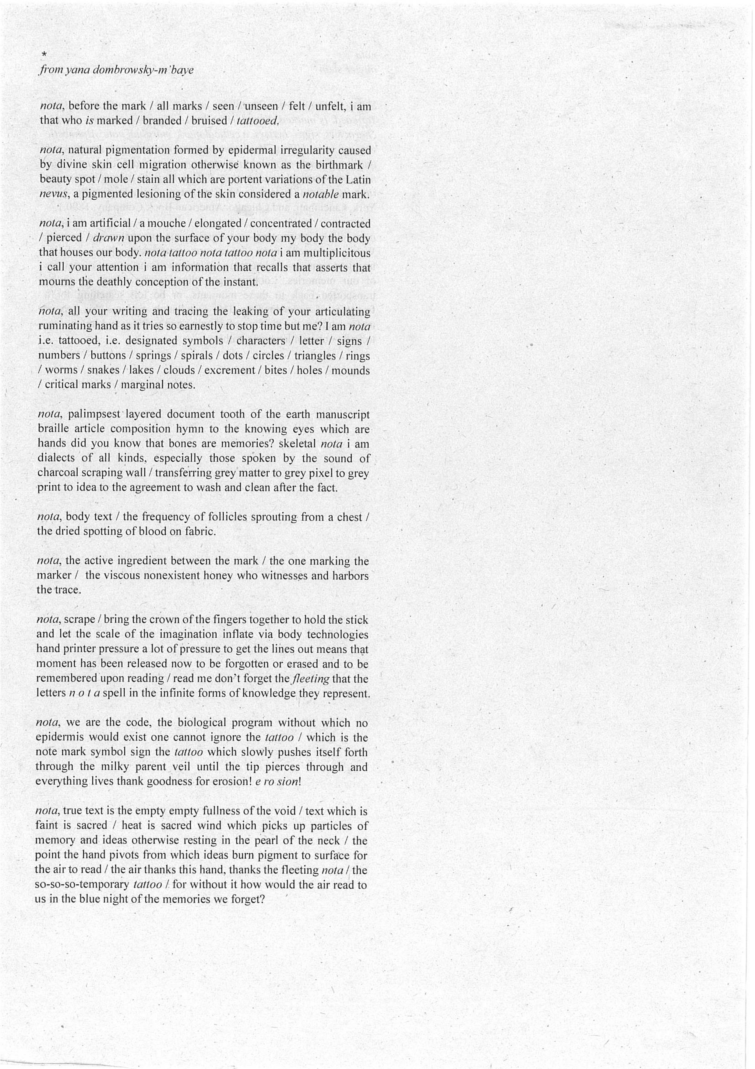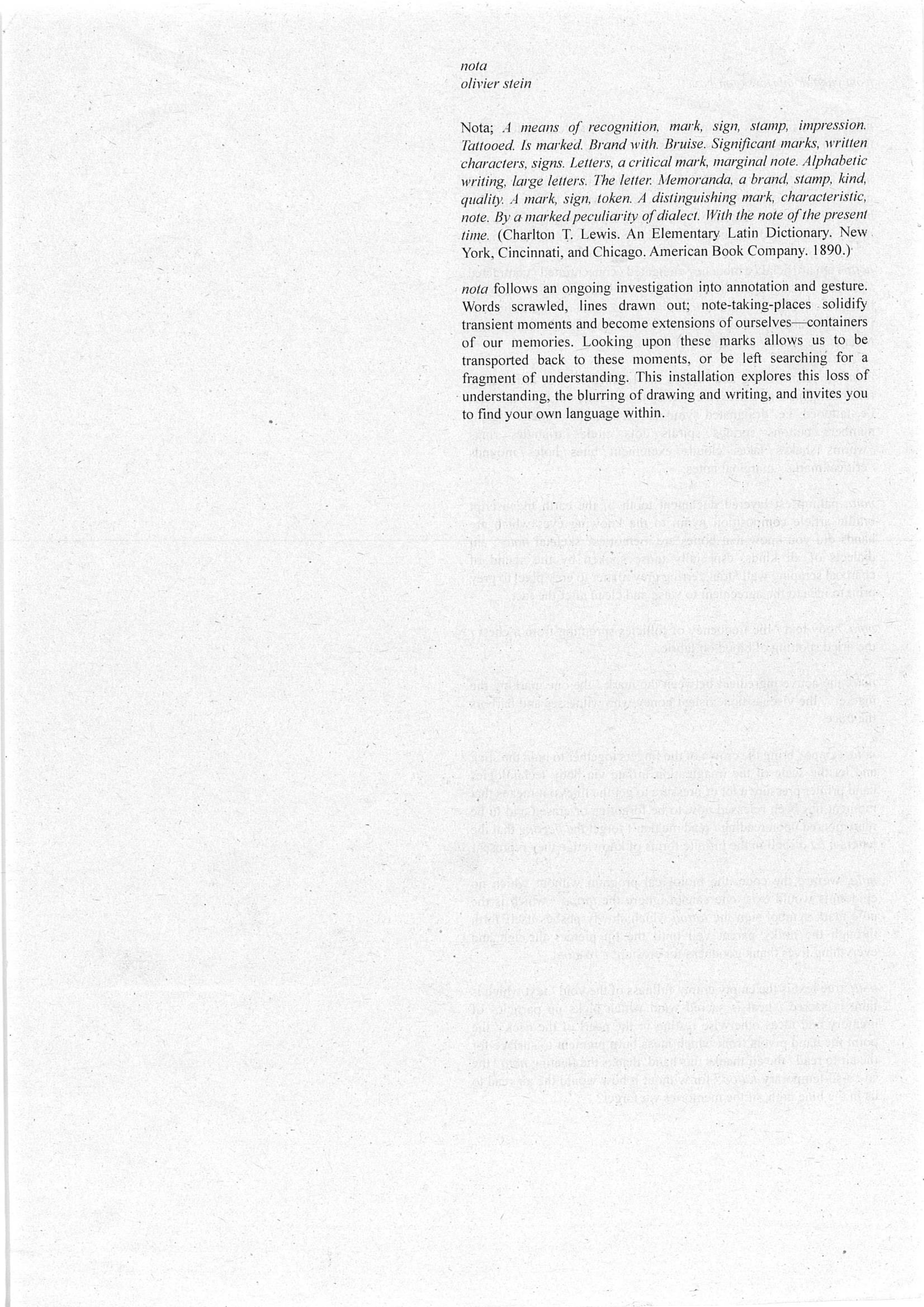 Written respoonse to Nota. charcoal transfer, carbon transfer, notations by Olivier Stein at Bruce tattoo and art salon. Photographs Olivier Stein.
